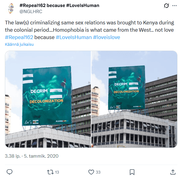 Vuoden 2025 lopussa kenialaiset lgbtq-aktivistit iloitsivat siitä, että homoseksuaalisten tekojen dekriminalisointia vaativa tapaus otettiin käsittelyyn korkeammassa oikeusasteessa. Kun tapausta vuonna 2019 käsiteltiin Kenian High Courtissa, eli Suomen käräjäoikeutta vastaavassa tuomioistuimessa, lakiin ei tehty muutoksia. Seksuaalivähemmistöjen oikeuksien parantamisen katsottiin silloin olevan ristiriidassa kulttuurin suojelun turvaavien perustuslain pykälien kanssa.