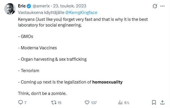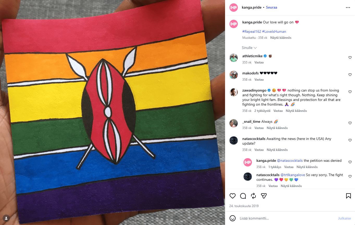 Kenialaiset queer-aktivistit pitävät ääntä etenkin sosiaalisessa mediassa, vaikka positiivisia muutoksia ei juuri näy ja homofobiset asenteet kasvattavat suosiotaan. Somekuplat polarisoivat, mutta voivat Kenian kaltaisessa kontekstissa myös luoda turvaa ja aktivismin jatkumisen kannalta elintärkeää motivaatiota.